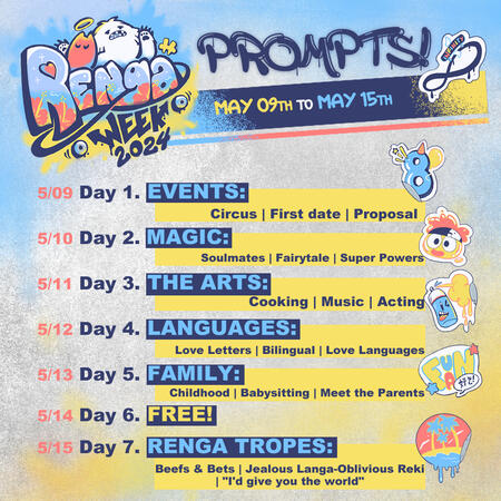 [Will Update With Prompt Information When We Have It]All the prompts can be done with writing, drawing, editing or whatever you want, sky is the limit! If you are going to participate don’t forget to use the hashtag #RengaWeek2024 wherever you share!There are official RengaWeek accounts on Twitter(X), Instagram, Tumblr, and BlueskyIn works that are NSFW, please be sure to put the appropriate warning. NSFW is allowed only if the characters are of legal age and it is properly tagged.On the other hand, plagiarism is prohibited. To be shared on socials or added to Ao3 collection, these rules must be followed.We hope you like and enjoy this week! You can tag us on any of the official socials so we can share your work! We're so excited to see your creations!