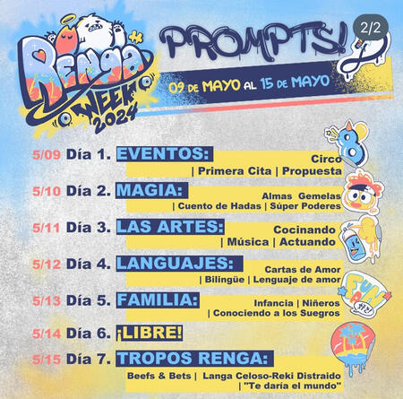 [Se actualizará la información en cuanto la tengamos]Todas las prompts pueden ser escritos, ilustraciones, ediciones o lo que quieras, ¡El cielo es el límite! ¡Si vas a participar no olvides usar el hashtag #RengaWeek2024 donde quiera que compartas!Hay cuentas oficiales de RengaWeek en Twitter(X), Instagram, Tumblr y Bluesky.Los trabajos que sean NSFW, asegúrate de poner la advertencia adecuada. El NSFW está permitido siempre y cuando los personajes sean mayores de edad y estén correctamente etiquetados.Por otra parte, está prohibido el plagio. Para compartirlo en las redes sociales o agregarlo a la colección Ao3, se deben seguir estas reglas.¡Esperamos que os guste y disfrutéis esta semana! ¡Puedes etiquetarnos en cualquiera de las redes sociales oficiales para que podamos compartir tu trabajo! ¡Estamos muy emocionados de ver tus creaciones!